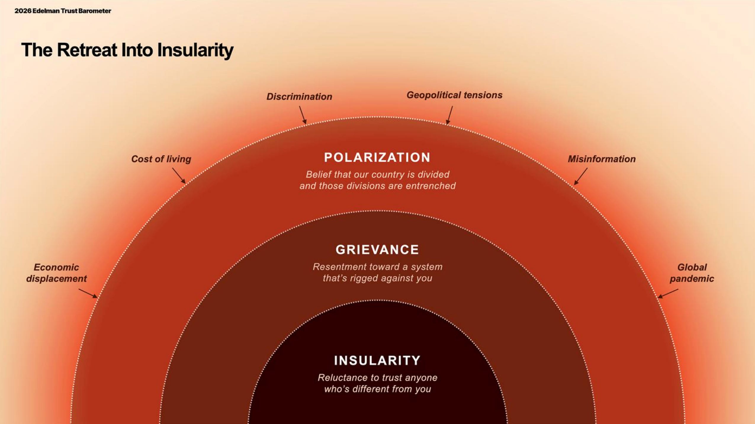 Não estou falando de desconfiança entre adversários políticos ou rivais comerciais. Estou falando de uma diminuição da disposição humana de considerar o outro. O relatório chama isso de insularity. A tradução mais honesta seria encolhimento. De perspectiva, de mercado, de possibilidades.