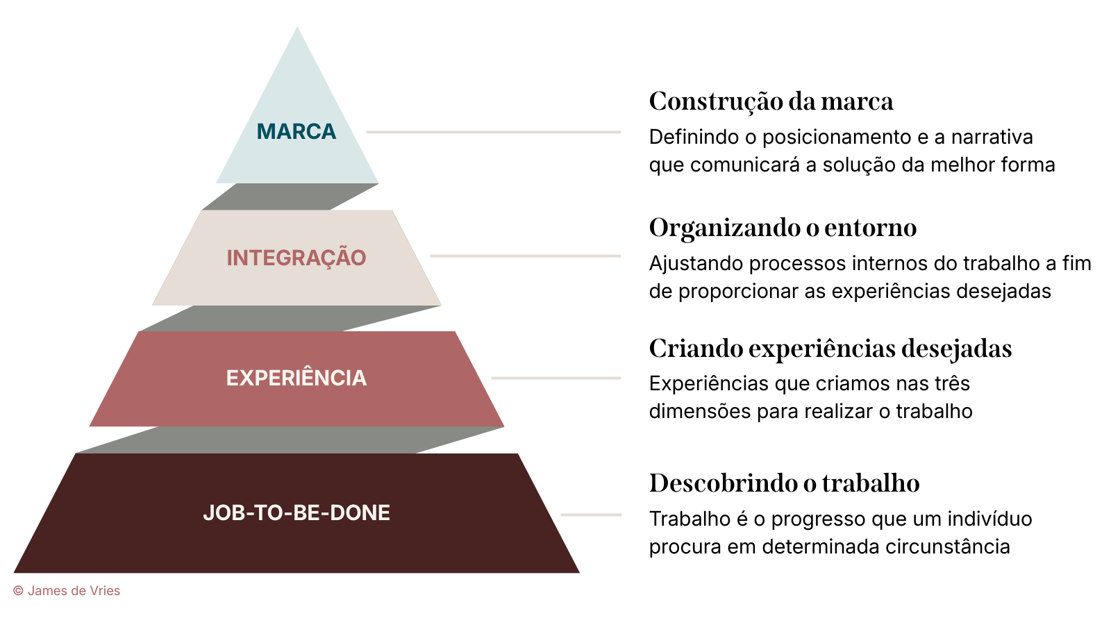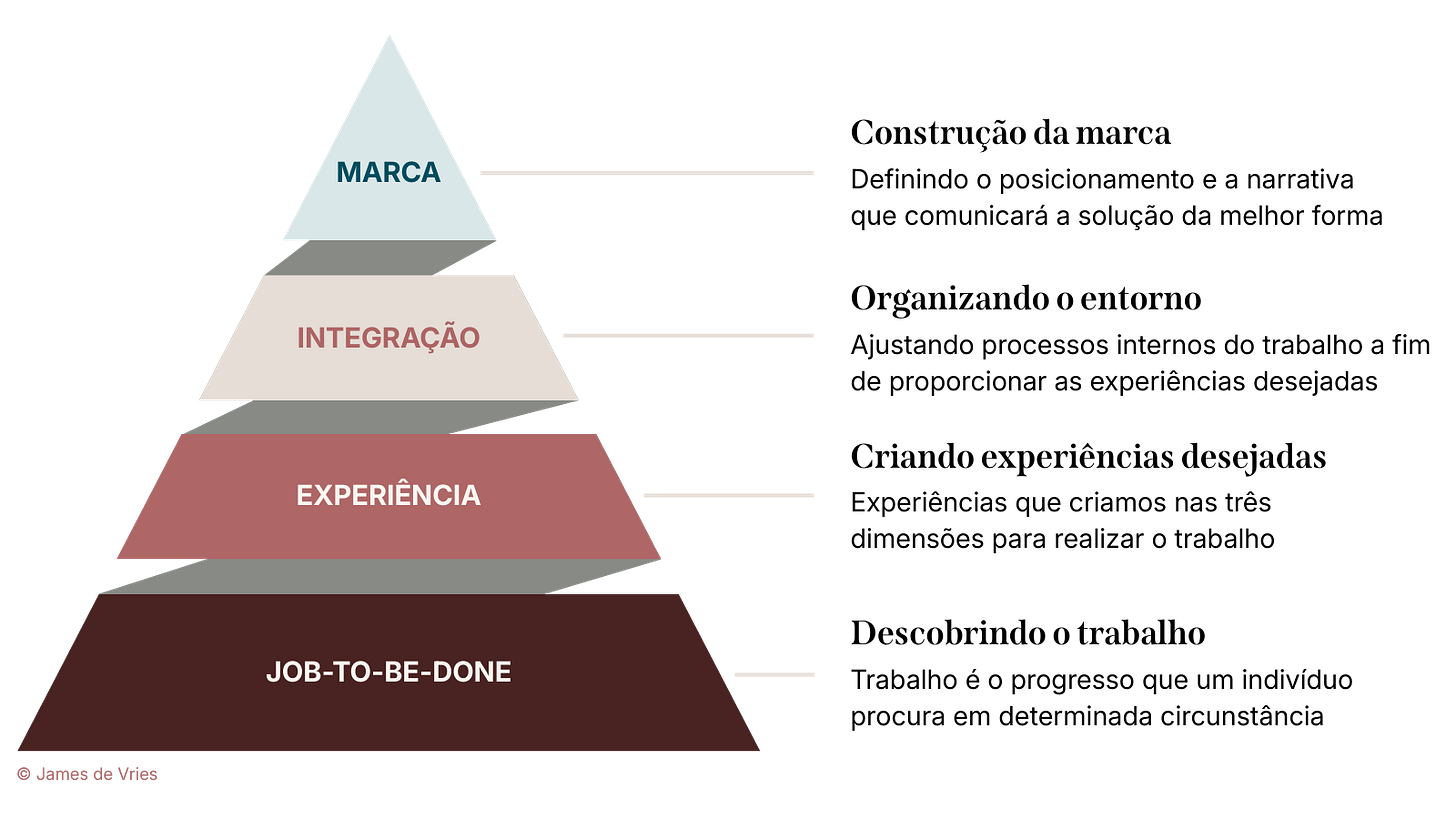 Funciona como uma pirâmide. Na base, o trabalho que o cliente precisa realizar. Acima, a experiência que a empresa desenha em torno desse trabalho. Depois, a integração de todos esses elementos de forma coerente. E no topo, a marca: o atalho mental que faz o cliente saber, sem pensar muito, quem contratar quando o trabalho aparece de novo.